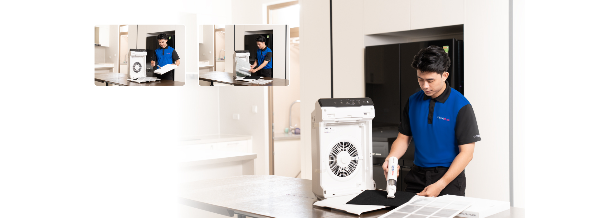 Dịch vụ được thực hiện tại nhà bởi nhân viên Toktokcare được đào tạo theo chuẩn, tác phong chuyên nghiệp, phong thái nhiệt tình, với lõi lọc chính hãng.
